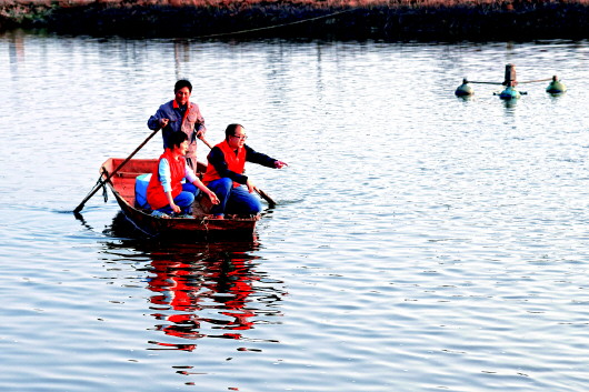 山东省枣庄市台儿庄区成立科技扶贫服务队,送科技下乡,助力脱贫致富。图为科技人员在查看水产养殖情况。 新华社记者郭绪雷摄