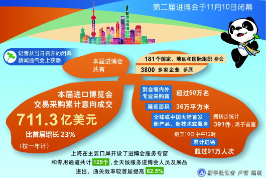 孙成海在当日举行的第二届进博会闭幕新闻通气会上说,第二届进博会延续“新时代,共享未来”的主题,共有181个国家、地区和国际组织参会,3800多家企业参展,超过50万名境内外专业采购商到会洽谈采购,展览面积达36万平方米。截至10日中午12时,累计进场超过91万人次。