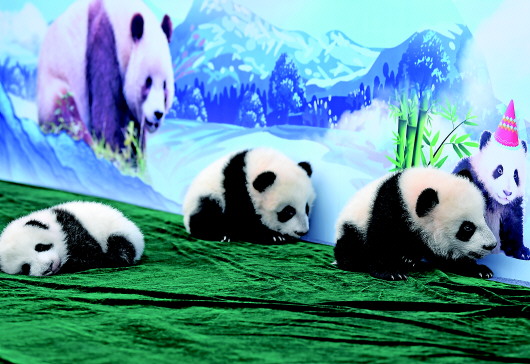 当日,2019年7、8月份新生的三只秦岭大熊猫幼崽在陕西省林业科学院秦岭大熊猫繁育研究中心亮相自己的“百日宴”,它们体重已经分别达到5200克、5120克和4898克,生长发育良好。它们的征名结果也于当日“官宣”。大熊猫楼生的宝宝名字为“秦酷儿”,大熊猫珠珠的龙凤胎宝宝名字分别为“佳佳”“园园”。新华社记者李一博摄