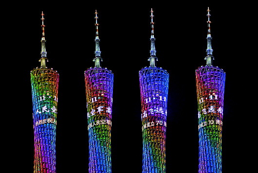 广州地标性建筑“小蛮腰”广州塔的上中下三段、LED灯光闪亮展现一个主题:人民空军高飞远航(11月11日摄)。 新华社发(范以书摄)