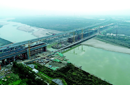 11月12日拍摄的银西高铁陕西咸阳渭河四线桥施工现场。近日,银(川)西(安)高铁陕西段咸阳渭河四线桥进入梁部施工阶段。新华社记者张博文摄