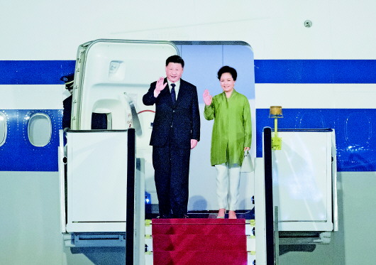 ▲当地时间11月12日晚,国家主席习近平乘专机抵达巴西利亚,出席金砖国家领导人第十一次会晤。这是习近平和夫人彭丽媛步出专机舱门。       新华社记者丁海涛摄
