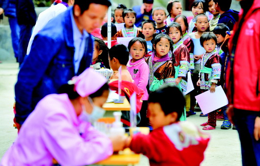 ▲小朋友在爱心送医活动中排队体检。11月16日,广西柳州市妇幼保健院组织党员志愿者来到位于桂黔交界的深度贫困苗寨——乌英苗寨,为当地桂黔两省区群众提供免费诊疗、体检、健康咨询,赠送部分常用药品,并向每户家庭赠送了家庭小药箱。新华社记者黄孝邦摄