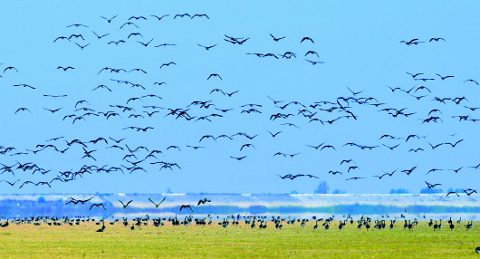 在鄱阳湖滨湖乡镇南昌县泾口乡,大批越冬候鸟在湿地上空飞翔(11月14日摄)。近日,大批候鸟飞抵江西鄱阳湖湿地越冬。 新华社记者彭昭之摄