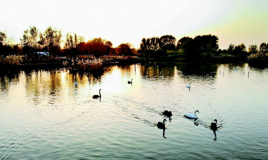 夕阳映照下的济南最大的城市湿地——济西国家湿地(11月18日摄)。 新华社记者王凯摄
