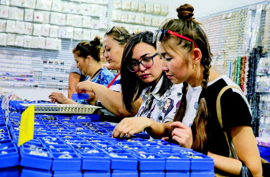 游客在中哈霍尔果斯国际边境合作中心的一处商场挑选饰品(8月11日摄)。 中哈霍尔果斯国际边境合作中心是全球首个跨境自由贸易区,2012年封关运营后,中心内游客人数呈快速增长态势。 新华社记者李鹏摄 |