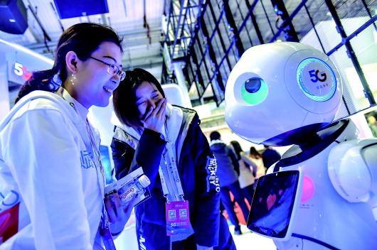 11月21日,参观者在世界5G大会上了解一款5G机器人。新华社发(彭子洋摄) |