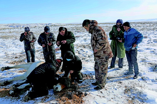 11月22日,新疆野马繁殖研究中心工作人员给“皇后”准噶尔213号母马替换项圈。 |