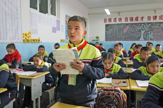 依明的二儿子如孜·依明,目前在新疆于田县第一中学7年级3班就读,这是他与县城的孩子们在一起上课(11月20日摄)。 本报记者沈伯韩摄 |