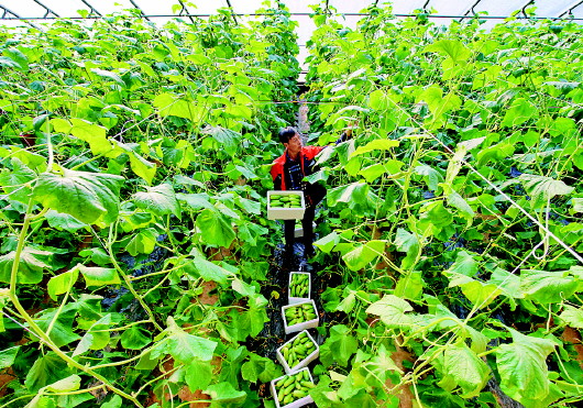 12月5日,河北滦州市的一位农民在采摘黄瓜。入冬以来,冀东地区农民纷纷投入冬季暖棚果蔬的工作中,变“冬闲”为“冬忙”。新华社记者杨世尧摄