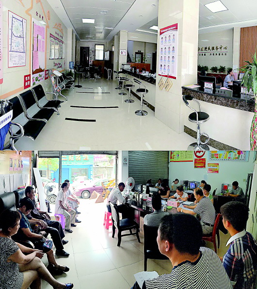 ▲拼版图片:上图:“瘦街道壮社区”后,秀江街道潭前社区党群服务中心宽敞的办公场所。下图:“瘦街道壮社区”前,秀江街道潭前社区简陋拥挤的办公场所。