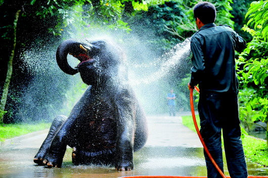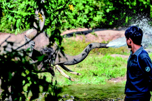 ▲11月12日,在中国云南亚洲象种源繁育及救助中心,“象爸爸”罗忠平为亚洲象“小强”洗澡。