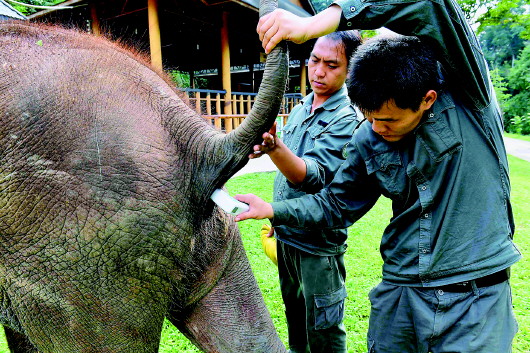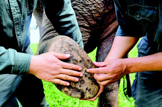 ▲11月12日,“象爸爸”们检查一只亚洲象的脚掌。 本报记者杨宗友摄 |