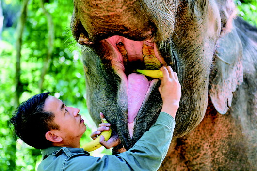 ▲11月13日,”象爸爸“罗顺才给一只大象喂香蕉。 本报记者杨宗友摄 |