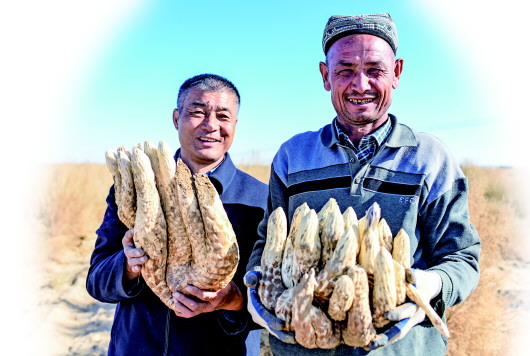 且末县英吾斯塘乡65岁的村民阿里木·穆沙(右)展示刚刚采挖出来的肉苁蓉(11月15日摄)。在连绵不绝的黄沙面前,且末县成功将治沙与致富相结合,引入社会资本参与治沙,采用“谁治理、谁受益”的政策鼓励科技入股和企业投入。 新华社记者王菲摄 |