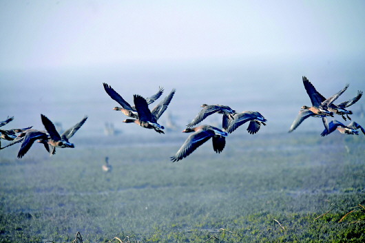 12月8日,一群候鸟在江西南昌市新建区南矶湿地上空飞翔。近日,大批候鸟飞抵位于鄱阳湖南部的南矶湿地越冬。 新华社记者彭昭之摄