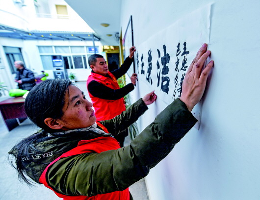 12月9日,锦城街道兰岭社区的党员志愿者把廉洁主题的书法作品贴在社区党群服务中心的墙上。
