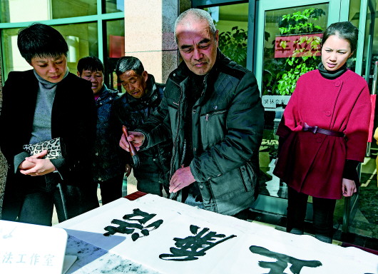 12月9日,社区书画爱好者在锦城街道万马社区书写廉洁主题的书法作品。