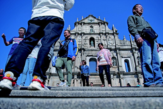 12月12日,旅客在澳门大三巴牌坊游览。 新华社记者张金加摄