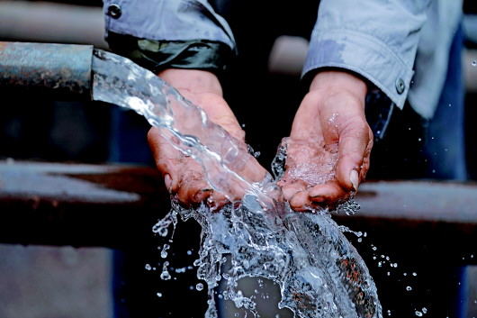 ▲11月20日,南岭村打井工程竣工仪式现场,一位村民正在用手接水。