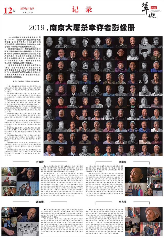 2019年是南京大屠杀惨案发生82周年。1937年12月侵华日军制造的南京大屠杀惨案,使30多万手无寸铁的中国平民和放下武器的士兵惨遭杀害,给劫后余生的幸存者留下难以抚平的伤痛和苦难记忆。 新华社记者从2014年开始整体性关注南京大屠杀幸存者这一特殊群体,六年来持续不间断寻访记录,已累计采访百余名年逾八旬的老人。在记者与时间赛跑、抢救性拍摄记录的同时,幸存者也在不断离世,从2018年底至今,又有14位幸存者相继去世。历史不容忘却,记忆不能逝去。