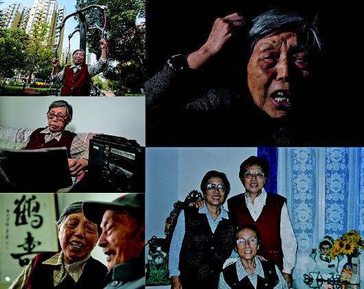 巫吉英 右上:巫吉英肖像;右下:巫吉英在家门口和大儿子张爱华、二女儿张月珍、小女儿张素琴(右)合影;左上:巫吉英在家门口与邻居聊天、晒太阳;左中:巫吉英在自己卧室内;左下:巫吉英在家门口和女儿聊天(拼版照片,12月5日摄)。
