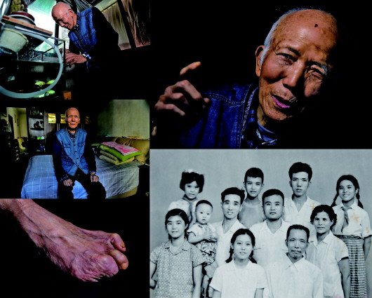周文彬 右上:周文彬在讲述经历;右下:上世纪60年代周文彬(后排右二)和父亲周忠义(前排右一)、大哥周文鑫(第二排右二)等家人的合影(翻拍照片);左上:周文彬在家侍弄自己养的观赏鱼;左中:周文彬在家中卧室内;左下:周文彬展示遭日本兵枪击成为残疾的左脚(拼版照片,11月15日摄)。