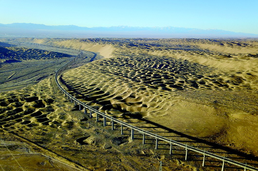 ▲敦格铁路沙山沟特大桥(12月11日无人机拍摄)。敦(煌)格(尔木)铁路沙山沟特大桥位于甘肃省酒泉市阿克塞哈萨克族自治县境内的库姆塔格沙漠内,是一座穿越活动性沙漠地区的特长桥梁,也是敦格铁路的重难点控制工程。据介绍,桥梁所在区域风沙活动频繁,四季及昼夜温差大,在建设过程中,中铁十一局集团有限公司的建设者根据沙层的厚度、分布及含水率的不同,总结出一套沙丘桩基施工工艺。 新华社记者范培珅摄