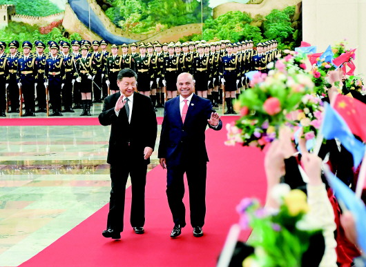 12月13日,国家主席习近平在北京人民大会堂同密克罗尼西亚联邦总统帕努埃洛会谈。这是会谈前,习近平在人民大会堂北大厅为帕努埃洛举行欢迎仪式。