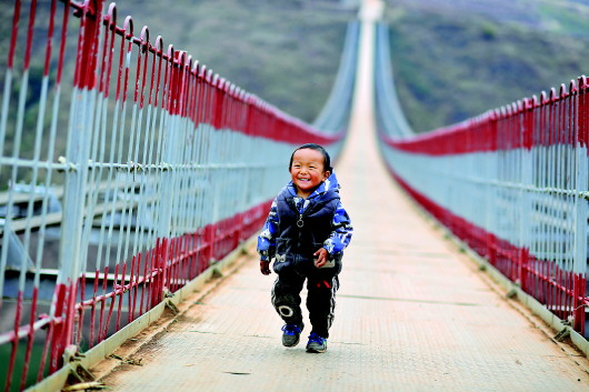 12月11日,一个孩子行走在贵州省威宁县玉龙镇“溜索改桥”后的人行桥上。