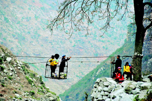 云南省会泽县火红乡的村民乘坐溜索到贵州省威宁县(2013年3月7日摄)。