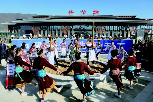 12月16日,少数民族同胞在成贵高铁毕节站前跳芦笙舞,庆祝成贵高铁全线通车。当日,成贵高铁全线通车。