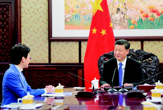 习近平表示,我们将继续坚定支持你带领香港特别行政区政府依法施政,坚定支持香港警方严正执法,坚定支持爱国爱港力量,并希望香港社会各界人士团结一致,共同推动香港发展重回正轨。
