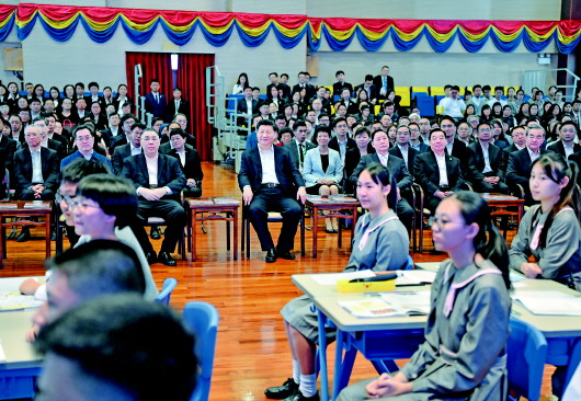 习近平在英才学校观摩了一堂中国历史公开课。15岁的高一学生倪可蓝说:“我们这堂课的主题是‘一国两制’与澳门。习主席在课后对我们进行了勉励,我受到很大鼓舞。今后,我会按照习主席的要求,认真学好文化知识,将来为澳门和祖国发展作出自己的贡献。”