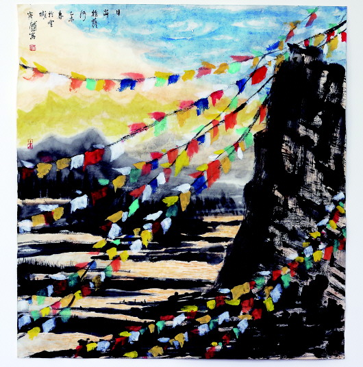 西藏得天独厚的大美风光和独特的艺术元素,在他独特的艺术笔法下,化成《吉祥西藏》《高原之晨》《雪域经幡图》《经幡送吉祥》等系列作品,获得业内的极大关注。