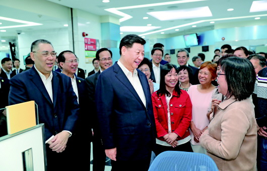 12月19日,国家主席习近平在澳门特别行政区行政长官崔世安陪同下,来到位于澳门黑沙环的政府综合服务中心和濠江中学附属英才学校,同澳门市民和师生亲切交流。这是习近平在黑沙环政府综合服务中心同澳门市民亲切交流。 新华社记者黄敬文摄