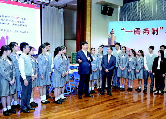 习近平在英才学校观摩了一堂中国历史公开课。15岁的高一学生倪可蓝说:“我们这堂课的主题是‘一国两制’与澳门。习主席在课后对我们进行了勉励,我受到很大鼓舞。今后,我会按照习主席的要求,认真学好文化知识,将来为澳门和祖国发展作出自己的贡献。”