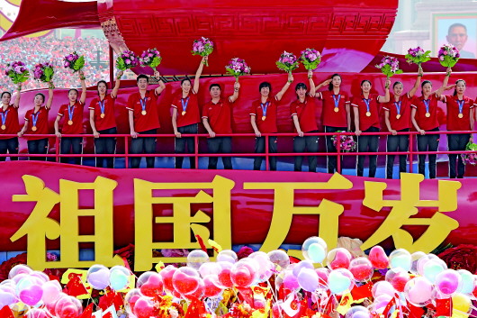 国庆群众游行中,中国女排乘“祖国万岁”彩车压轴出场。这不禁让人想起,35年前,刚刚获得1984年洛杉矶奥运会金牌的中国女排,也曾站在国庆游行彩车上向全国人民报喜。