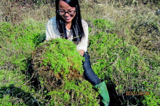 ▲2013年10月26日,刘玲在山坳里采野生水苔。 受访者供图