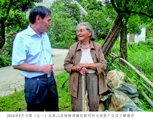 下乡调研、走访贫困户是方荣工作的重点。经常同方荣一起下乡的黄冈市扶贫办副主任王振堂发现,方荣有个“标志性动作”。每到一户贫困户家,落座后,他都会直奔厨房,打开水龙头看有没有水,再揭开锅盖看有什么菜。最后,回到卧室,打开柜门看有没有几件像样的衣服。