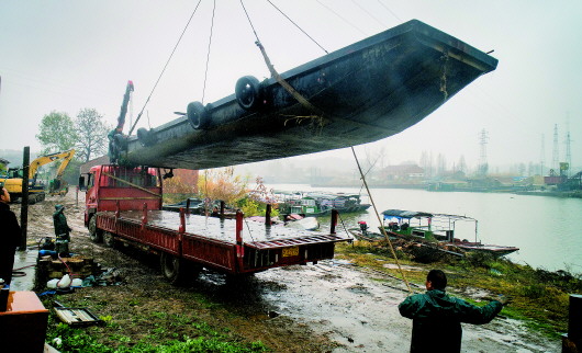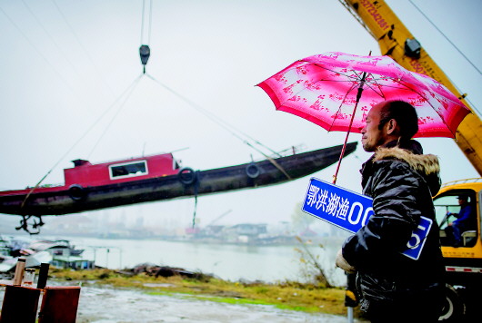 ▲12月25日,长江捕捞村渔民夏明星注视着被吊起的渔船,他手上的渔船编号牌也即将被收回。