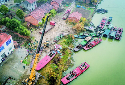 ◥12月25日无人机拍摄的长江新螺段白鱀豚国家级自然保护区渔船拆解现场。 |