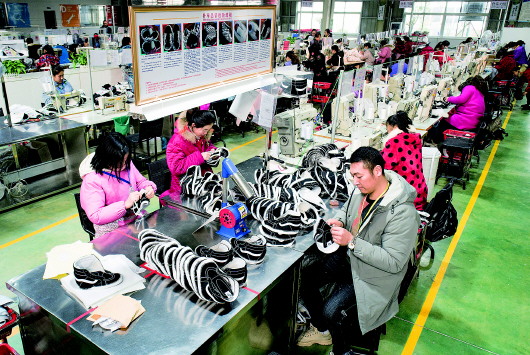 12月26日,“上岸”后的徐保安(右一)在威弘鞋业公司生产车间内工作。 |