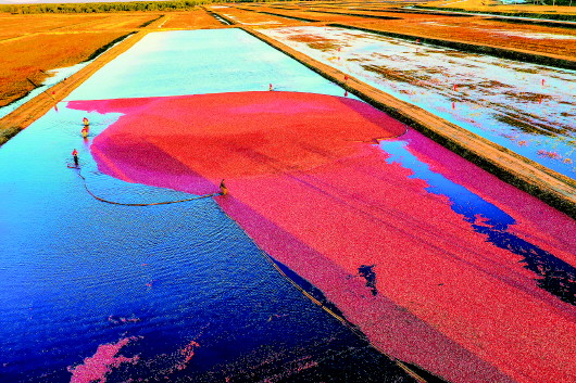 “冬天用水封冻‘冬眠’,有助于第二年生长!”李峰随手抓起一根细细的蔓越莓枝蔓说,它生长低矮靠近地面,由于六七月开花时形似仙鹤又被称为“鹤莓”,红红的果实椭圆饱满似樱桃般大小,收获期用水冲灌田地,一粒粒漂浮在水面上如同红色海洋。