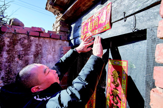 村民在为马爱明的婚礼贴对联(2019年12月30日摄)。 |