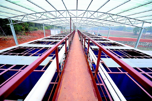 “因为我把鱼养在22米长的水槽里,水流带动鱼不停游动,像跑步一样,所以大家都说我养的是‘跑道鱼’。”作为湖南省第一个采用这种方式养鱼的人,邵东市九贝生态养殖场负责人李三明很是自豪地向记者介绍,他在鱼塘里共铺设了34条“跑道”,通过电机控制,可以调节水流的速度和大小,用来将鱼群产生的粪污和饲料残渣冲刷到与水槽尾部连接的集污区内,里面的污水经过两个过滤坝和沉淀池、曝气池、净化池等系统,可以再次利用。