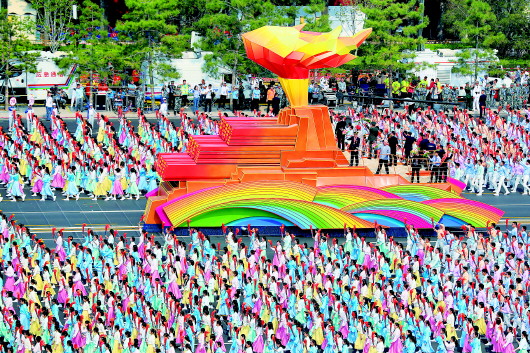 ▲2019年10月1日上午,庆祝新中国成立70周年大会在天安门广场隆重举行。这是群众游行中的“凝心铸魂”方阵。