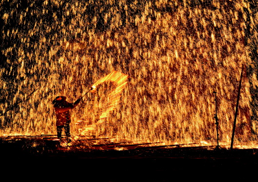 ▲1月2日腊八节,“打树花”的师傅正在表演当地绝技“打树花”。 本报记者李贺摄