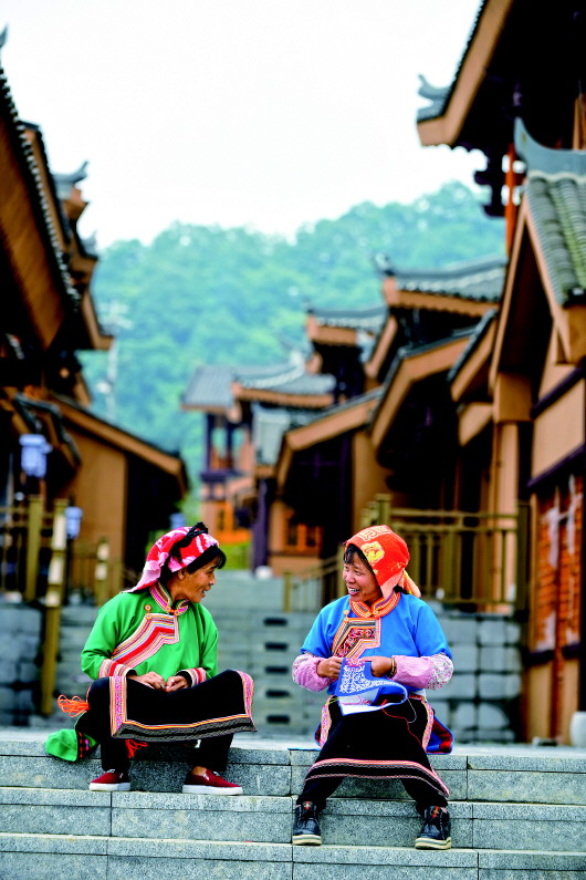 来自贵州省晴隆县三宝彝族乡的两名搬迁户在阿妹戚托小镇里刺绣(二〇一九年六月六日摄)。 新华社记者杨文斌摄