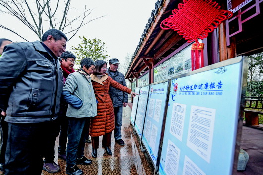 ▲浙江长兴县虹星桥镇港口村党总支委员许方方(右二)向村民介绍村干部述职述廉情况。港口村将村班子成员个人述职述廉报告张贴出来,接受村民监督。